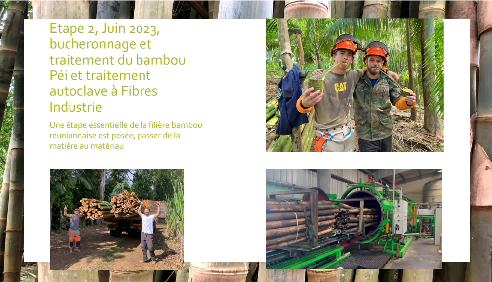 • L’association ECHOBAT, réseau d’entreprises, tel que FIBRES INDUSTRIE, PERMAKILTIR RéUNION, La BAMBUSAIE DU GUILLAUME et d’autres, engagées dans la construction durable à La Réunion, a constitué un consortium financé par le TO et l’ADEME pour conduire en 2025-2026 une étude de faisabilité sur le déploiement de la filière, de même que des essai de plantations et des essais de transformation matière.