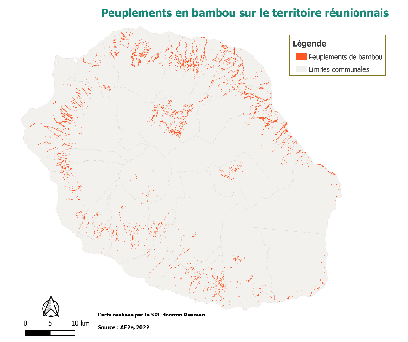 La ressource. Quantifié formellement en 2023 par la SPL Horizon, Le bambou, hors du Parc National et hors ZNIEEF, sur les territoires agricoles et urbains, accessible à l’exploitation, recouvre environ 277 hectares, dont 29 (10%) dans le domaine public et 248 (90%) dans le domaine privé (individuel ou personne morale) avec des peuplements couvrants des surfaces très variables mais principalement entre 100 et 500m².