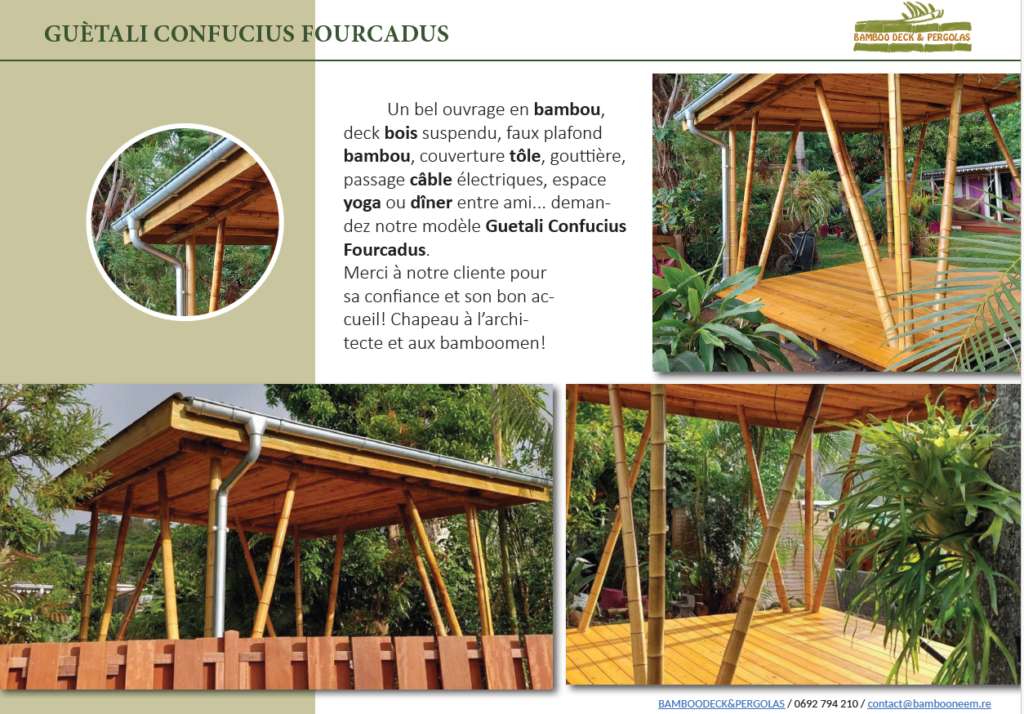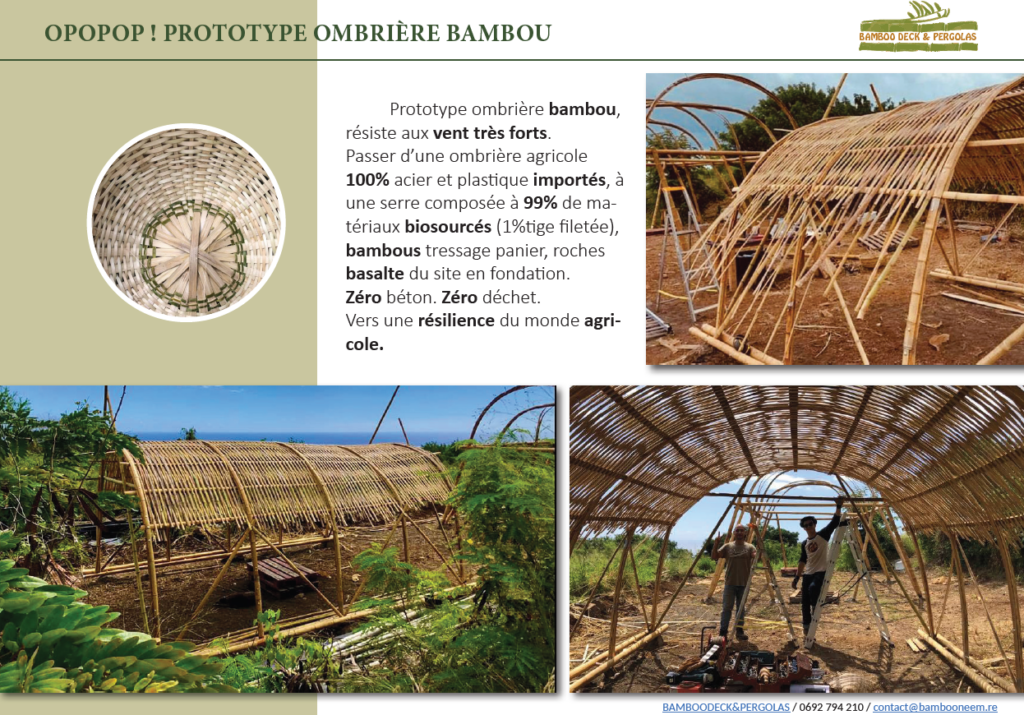 • La société BAMBOONEEM.RE, entreprise familiale, père, neveux et filles, créée en 2018, lance une marque artisanale (BAMBOODECK&PERGOLA) et explore principalement les ouvrages structurels : kiosques, pergolas, varangues, serres agricoles, aménagements intérieurs et mobilier. Environ 60 ouvrages de structures légères ont été réalisés, principalement avec des particuliers, amoureux du bambou. En 2020, l’entreprise devient OF, Organisme de Formation. Ses chantiers écoles portent notamment sur la mise au point de structures bambou résistantes aux vents cycloniques.